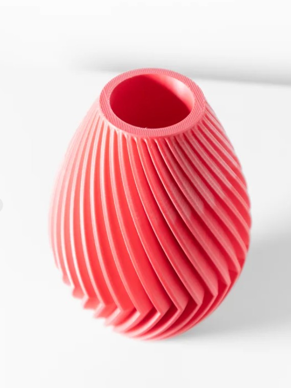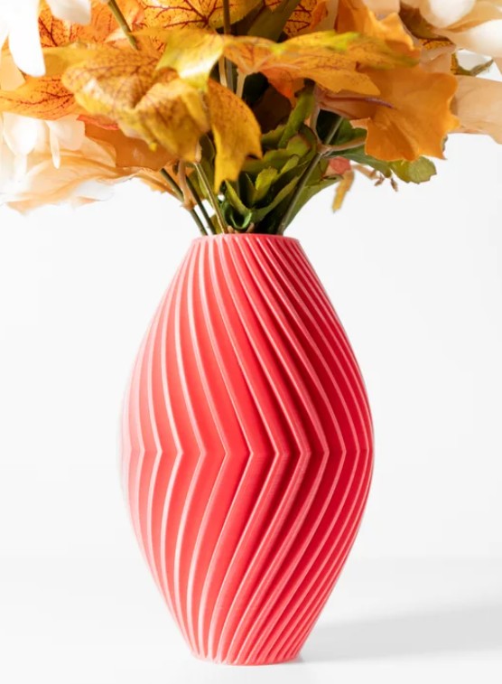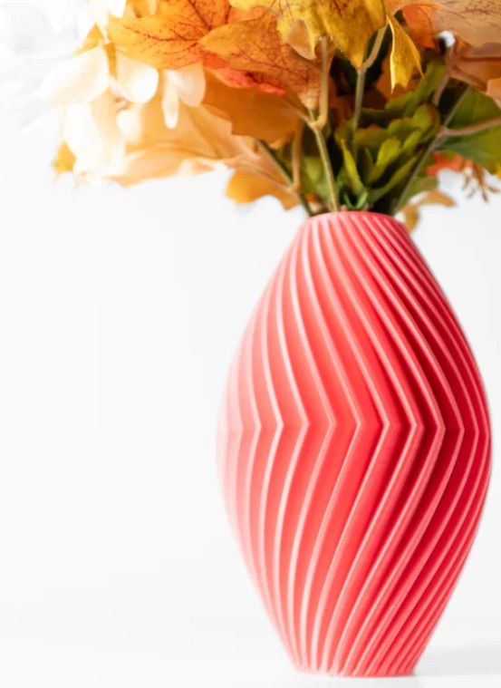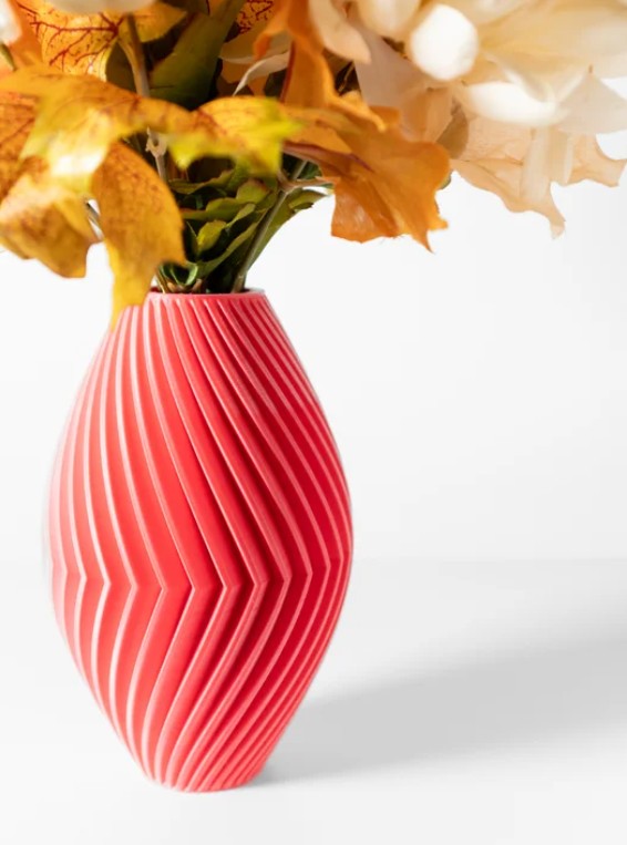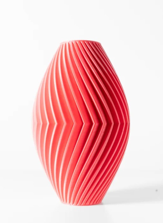 Ziva is a sculptural vase that dances with light and shadow. Its bold zigzag form and vibrant coral hue make it a striking centrepiece — whether filled with blooms or styled solo.